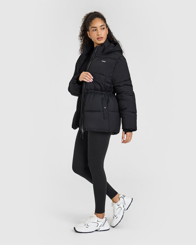 Warm up and feel snug in the Mid Length Puffer Jacket. With a mid-length design and a hood, it will keep you dry and comfortable on colder days. Your valuables will be safe while you’re on the go, as it features an internal chest pocket. The branded drawstrings at the waist give you a cinched-in, flattering look.